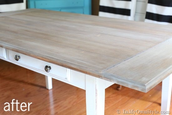 A few months went by and I took on the transformation of the table. I stripped the top and re-stained it using Driftwood Finish. I painted the legs of the table with DIY chalk paint.