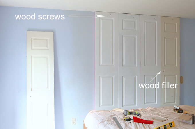 5. Start by placing the center board first, then work out to each side. Each door was placed on the horizontal board and then screwed into the wall in two places (top and bottom of door) and into studs. We counter sank the screws and covered the screw heads with Spackle/wood filler. I also filled the holes where the doorknobs used to be on the doors. Once it was dry, I sanded the areas smooth with 100 grit sandpaper.