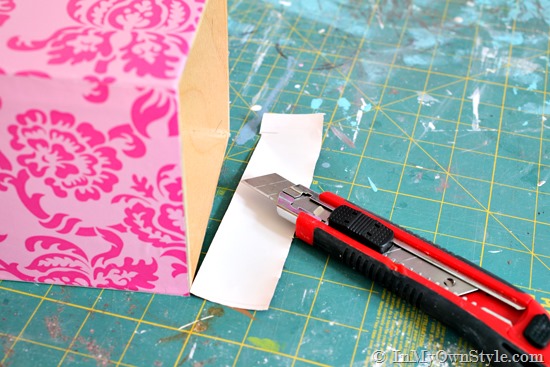 Optional: Since the gift wrap I used has a vinyl feel to it, I did not seal it. If you want to add a protective sealer – use Mod Podge spray sealer or any non – yellowing water based polyurethane, like Minwax Polycrylic. Test on a scrap piece of gift wrap first to make sure it won’t change the color of your gift wrap.