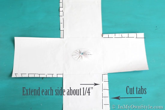 3. Do not cut out until you add 1/4” on the right side line of each side of the pattern – draw a parallel line so that you can make tabs that will wrap around each side of the box.