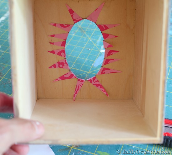 10. To hide any cut lines along inner edge of hole, cut a thin piece of giftwrap and use ModPodge or white glue to attach it. Let dry.