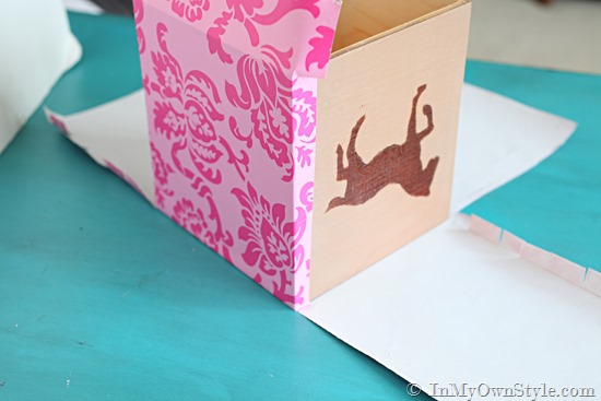 6. Apply spray glue to wrong side of gift wrap. Let it get tacky and then line up center of box back on the gift wrap. Bring one side up and smooth with your hand. Fold the tabs to the side and press smooth with your fingers.