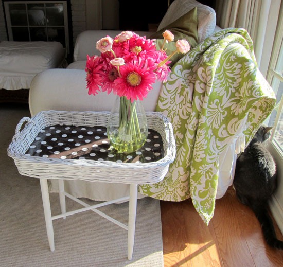 I am into movable furniture, especially accent tables lately. I love the fact I can easily take this out to my deck or patio and place a drink or candle on it and then easily bring it back in when I come back inside. In the winter I have a big basket by the chair with warm and snugly throws. I lined the tray with polka dot fabric for another pop of color.