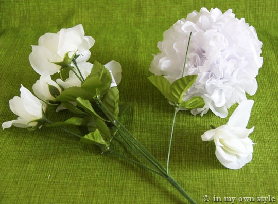 - Dollar Store flowers that have medium/light green colored stems and leaves – not dark green stems. You can even use real tree branches