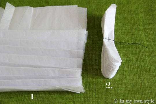 1. Fold over a piece of tissue paper lengthwise. If you want big blooms – just make the space between the folds larger. If you don’t want loop for the petals – trim the top of the folded paper so there are no folds.