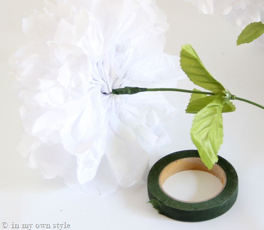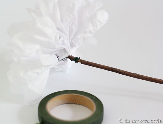 6. I poked the tip into the center of the tissue paper flower and then wrapped the wire around the stem to secure. You could also bend the tip of the fake flower stem to create a hook to wrap the flower and the wire around. I did a few each way. Cover the wire with florist tape.