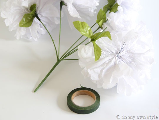 In this photo you can see I have most of the tissue paper flowers attached to the fake bouquet stems.