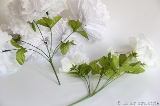 BEFORE: White Rose bouquet I took apart on the right. AFTER: Tissue paper flowers on the left.