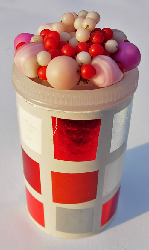 Vintage clip-on earring with the clip removed hot glued to the top. Cover for Canister: A cut section of a Neiman Marcus Christmas catalog cover.