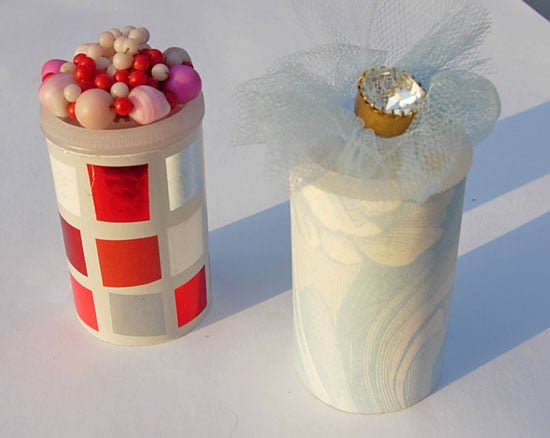 Mother of pearl button with a tulle rosette and rhinestone button glued on. Cover on canister: Gift-wrap