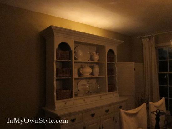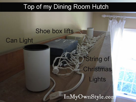 I wish my dining room hutch came equipped with lights, but it doesn’t. I had to add my own. Here is the top of my dining room hutch. Pardon my dust :) I have two can lights and one string of white Christmas lights. They are plugged into an extension cord that runs down the back of the hutch and into a wall outlet. To turn them on and off I just have to plug the extension cord into the outlet. I don’t use these lights everyday – just for special occasions or when I want to add some ambiance to the room at night.