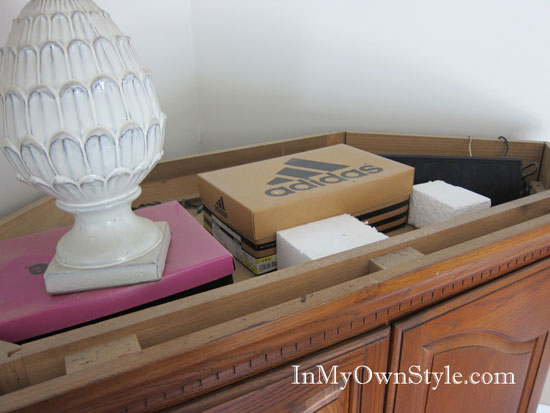 The answer – shoe boxes, books and foam are free and the perfect way to make lifts so the decorative items placed on top of cabinets and hutches look like they are level with the top.