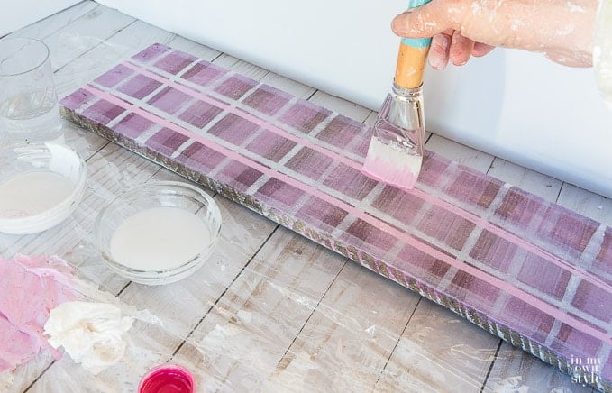 Here is what I made with the rough board… I painted a pink, purple and white plaid pattern on the board and dry brushed white paint on the sides.