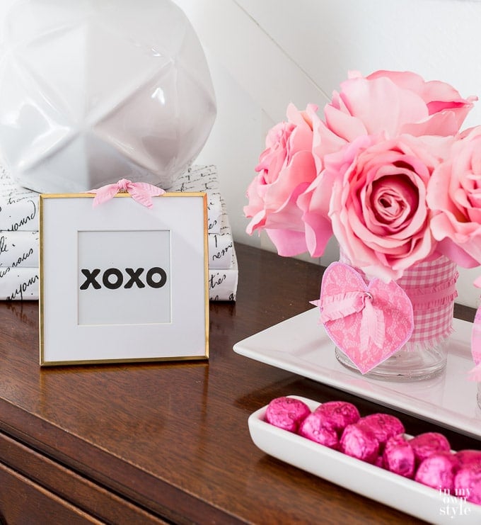 I like to keep the space neutral so when the seasons change and holidays like Valentines Day come around, I have a surface to simply add a little holiday touch. Nothing crazy, but simple and pretty. Using white and neutral colors on the walls allows me to make seasonal color changes that pop out and become the focus in the room.