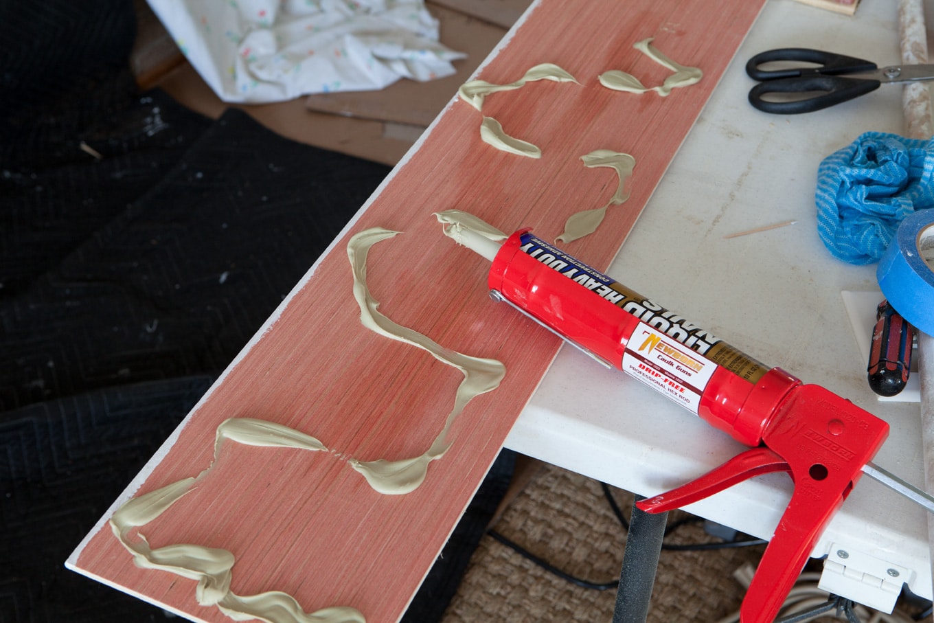 I started from the center and worked out to each side. The last plank on each side had to be cut narrower to fit the wall. I used painter’s tape to help hold the planks in place while the Liquid Nails dried.