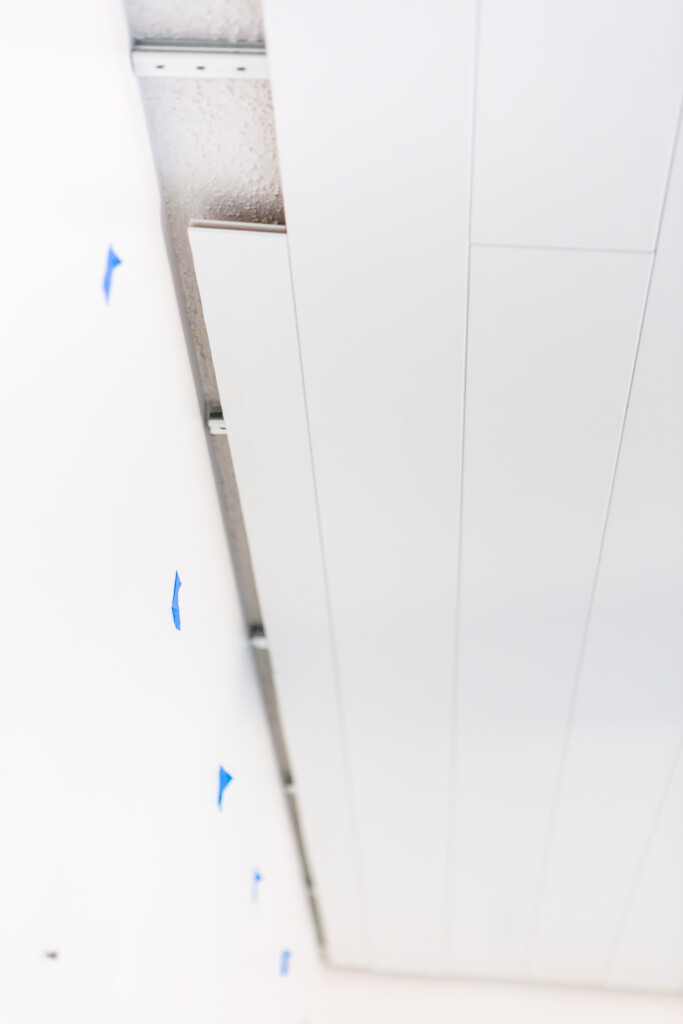 Armstrong Ceilings offers an Easy Up® track and clip system which makes installing beautiful ceiling planks over your existing popcorn ceilings very doable. We chose the smooth painted white planks, but there are many color and wood texture options available.