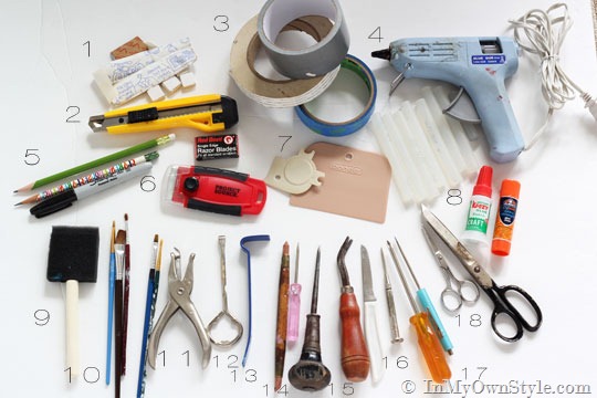 1. Sticky tabs and glue dots are perfect for placing on a back corner of a picture frame hanging on the wall to keep it straight.  2.Mat Knife – easily cuts cardboard to make fabric backdrops for shelves.  3. Tape assortment – double stick to hold down area rugs, duct tape works in many ways, but can be used to make tape loops to place behind crooked frames on the wall.  Fusible web to hem curtains and attach trim with no sewing  4. Glue gun and glue sticks – used to do so many things from hemming curtains to filling a hole in the wall so a screw or nail will stay in place.  5. Pencils and markers to jot down ideas or sketches.  6. Razor blade scraper– get those tough HomeGoods price tags off glass and other smooth items.  Cleans gunk and or splattered paint off of glass after painting.  7. Plastic scrapers for scraping price tags or gunk off non-glass items.  8.  Glue – Fabric, instant, and stick.  Make instant no-sew treatments with fabric glue. Instant glue can fix a broken vase or plate.  A simple glue stick can be applied to a wallpaper that has peeled up or the seam.  9. + 10. Paint brushes for touching up furniture that has been scratched or worn or dinged.  11. Paper hole punch   12. Paint can opener  13. Mini pry bar comes in handy to open a drawer on a piece of furniture when it is sticking or doesn’t have a knob.  14. Rubber tipped pointer – I think they sell these in the fine art aisle in craft stores. It is perfect for removing those stubborn little pieces of painter’s tape. Rub the rubber end over the tape and it will provide traction to your movement to remove the tape.  15. Awl – used to make holes in just about anything.  16.  Screw and nail remover. I also have the little knife that I use to pry things open.  17. Screwdriver.  18. Scissors – One for general use and one for fabric