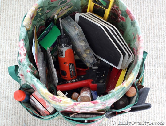 I don’t have expensive tools, and most everything is pretty basic in this toolbox, but I learned to use them in creative ways when I worked in retail display.  I also learned that I will never need all of them at one time, but am very happy when I do need that certain something – I can find it quickly and hang a curtain rod or make a cover for a cushion.