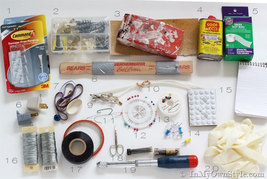 1. 3M Command strips – these are the best  – they hang, corral, and help organize    2. All sorts of nails, screws, picture hangers, and anchor screws   3. Sanding block and sandpaper  – sand furniture before painting.  4. Goo-Gone –cleans off gunk on anything, even your hands.  5. Glue Dots mentioned above to hold frames in place. They can also hold up wallpaper to a wall.  I used them in my pantry. When I want to take the paper down – it is quick and easy.  6. 3-prong electrical connectors – to attach to a lamp that may come with a three prong plug and your outlet box or extension cord only accepts 2 prong plugs  7. Rubber bands – use to puddle drapes  8. DIY Picture hanging tool – to see how it works  – I wrote about it over on Momtastic.  9. Safety pins – for making instant covers for cushions and pillows  10. Zip ties – To attach rods to nails to make rod brackets when you don’t have any.  Lay the rod on top of a nail or screw that is not nailed into the wall all the way.  Wrap the zip tie around tightly to hold rod in place.  11. Ornament hooks – for Christmas decor  12. Straight pins – use in place of a nail or screw when hanging something on the wall. It leaves only a teeny-tiny hole.  13. Fishing line – to tie or hang things invisibly.  14. Push pins and thumb tacks to hold drapes with tieback to the wall.  15. Memo Pad – notes and sketches  16. Wire – very helpful when putting up holiday decorations and to hang framed art on the wall  17. Electrical tape and super double stick tape  18. Tiny scissors  19.  Yankee Push Drill and drill bits – this is an old-fashioned tool, but works great.  In the handle there are different size drill bits that are easy to change. Once the bit is attached, you just push the drill into a wall to make a hole so you can hang curtain rods.  20. Rubber gloves