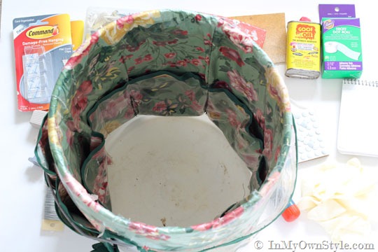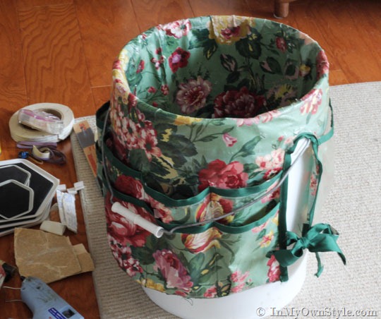 I use a 5 gallon paint bucket to carry my tools around. I made a tool bucket apron for it a long time ago. It has been the perfect way for me to take my tools wherever I go. I made the pattern myself after seeing a Simplicity pattern for one.  I don’t think they sell the patterns any longer, but I did find a few resources (at the end of the post) if you are interested in making or buying one similar.  To protect the fabric from getting dirty I covered the fabric with ThermOWeb Iron-On Vinyl. I didn’t think it would last long, but it did – so far 18 years.