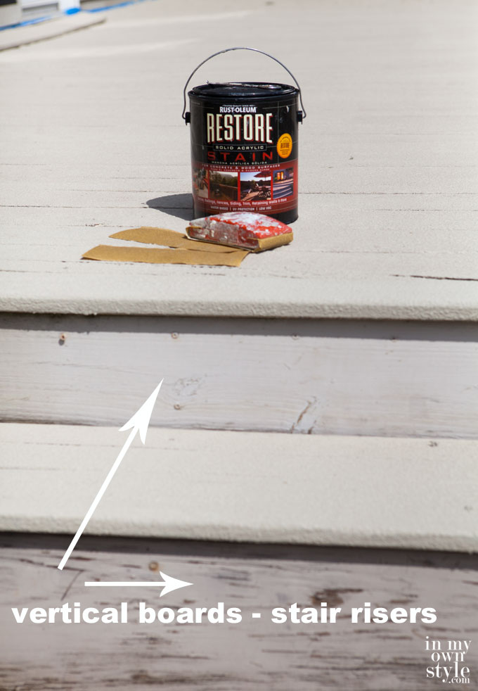 7. For step/stair risers, I sanded them with 100 grit sandpaper using a hand sanding block to smooth out the previous finish. I then used the bristle brush to apply the Solid Acyclic Stain. I applied 2 coats.