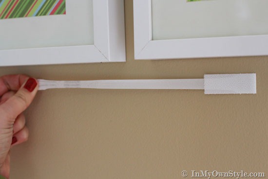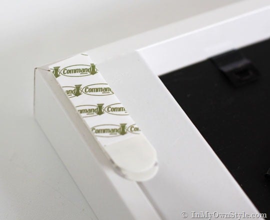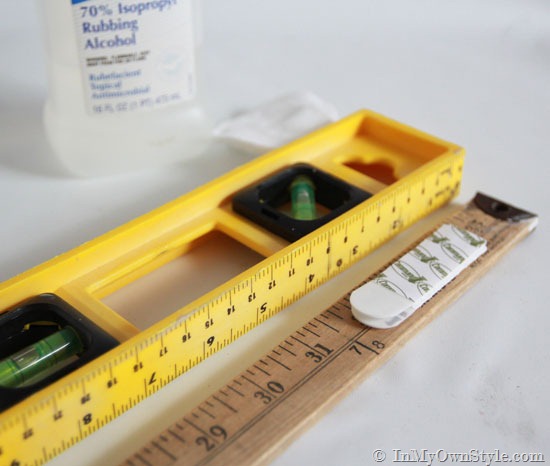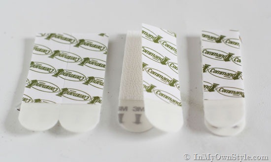 If you don’t have a laser level to help hang your frames at the same height across the wall, you can easily use a yardstick and 2 sets of Command Picture Hanging Strips to help you hang your frames straight. On the back side of a yardstick, attach one set of strips horizontally to each end. The pull tabs can face in or out – it doesn’t matter. ( I will explain how to use this later in the tutorial.)